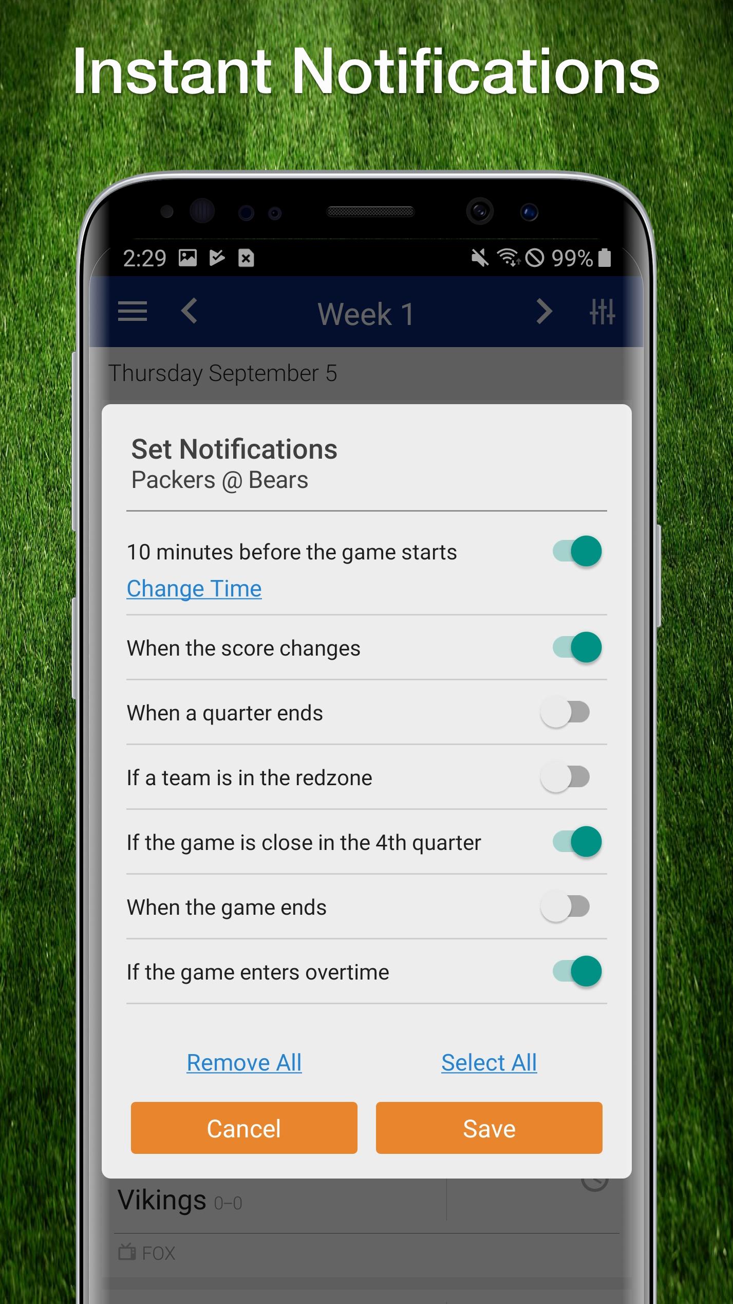 * Never miss a game! Set an alarm and be reminded to tune in.