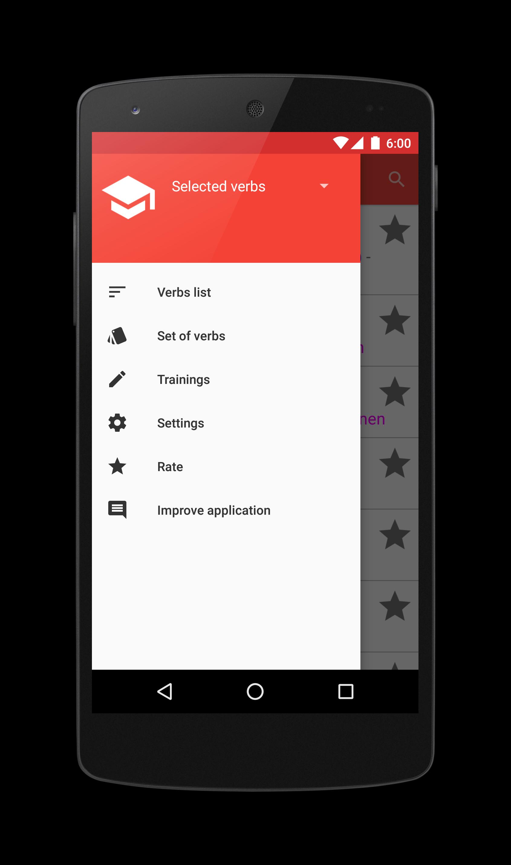 يوفر التطبيق قائمة German Irregular Verbs . يحتوي كل فعل على أربعة أشكال زمنية ونسخ صوتي. للاستماع إلى نسخ الصوت لا يتطلب الاتصال بالإنترنت. يمكنك أيضًا التحقق من معرفتك ، من خلال إجراء الاختبار: "تهجئة الفعل".