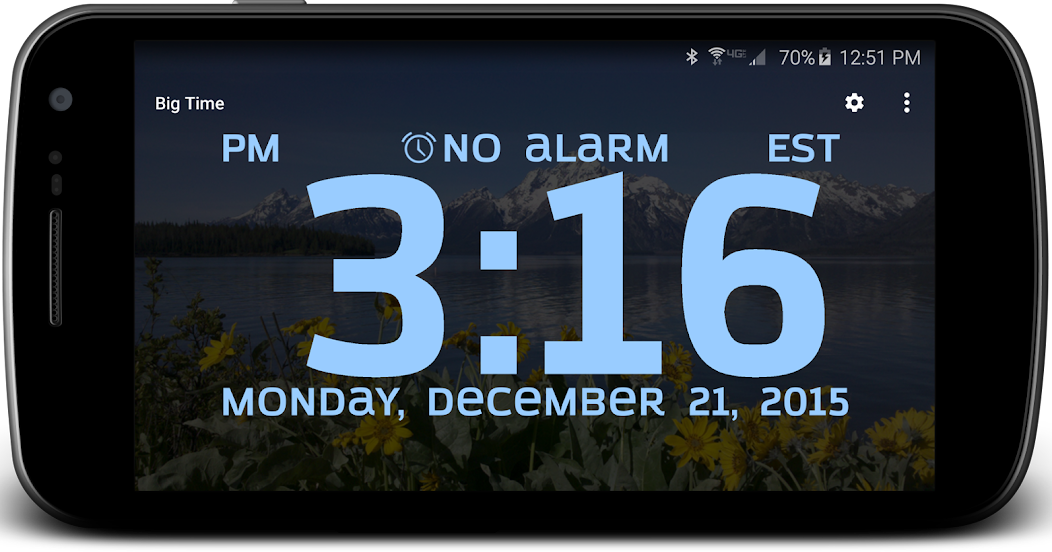 Big Time - elegant desk and night stand clock with time that fills the display. Also displays date, time zone and the next active alarm (if set). Touch the screen to dim for night use. Easily adjust night time dim level or set to automatic based on surrounding light (sensor if present). Use as a home screen widget or add on your lock screen. Can be run as a Daydream when docked. Use (included) photos as background or select a background color. Select one of four font types and colors.