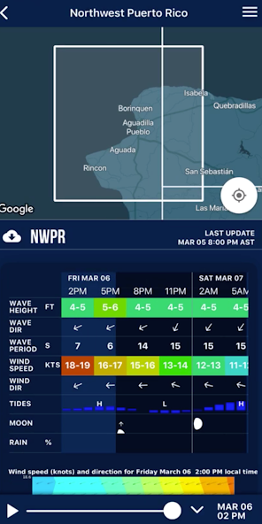 • Current Conditions: Wind, Waves, Tides, Moon Phase, Cloud Coverage and Rain Probability