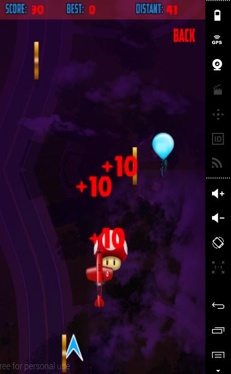 With the prowess Mario Air velocity Adventure you can play by choosing between 2 players, pull the player, cross and earn the coins, mushrooms, balloons and others, and avoid rocket, fire, bombs and other enemies and obstacles, don't forget to moving your android device in right and left to increase more of points and increase your score, cross the arrow to load the gas nitro , put gas nitro to increase your speed.