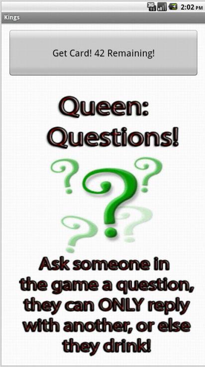 Lassen Sie uns diese Party beginnen! Wer braucht ein Kartenspiel, um Könige zu spielen, wenn es jetzt auf Ihrem mobilen Gerät verfügbar ist? Mit der einfachen, sauberen Schnittstelle können Benutzer einfach eine große Schaltfläche auswählen, um eine neue Karte zu zeichnen. Das Spiel basiert auf dem Kings -Kartenspiel mit den folgenden Regeln: