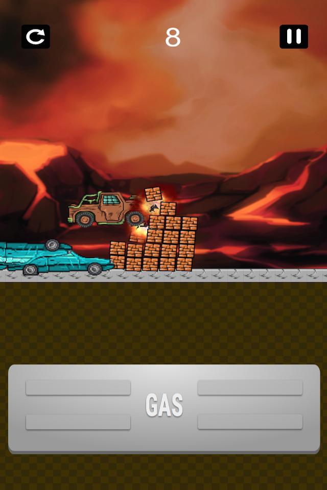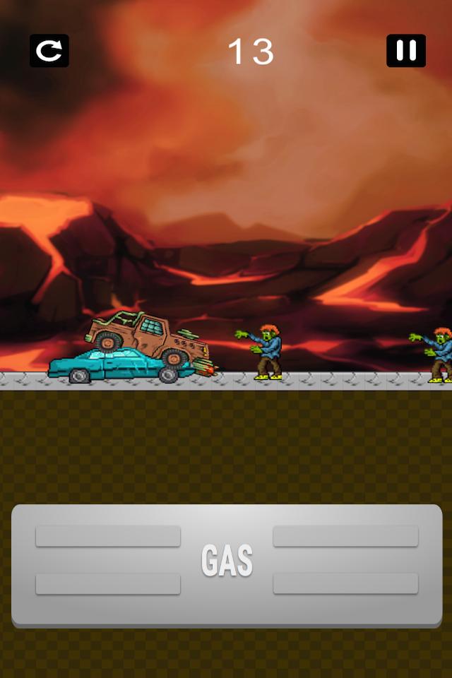 Rennen Sie Ihr Auto entlang der Straße und versuchen Sie nicht zu stürzen. Starten Sie Ihr Auto von den gestapelten, um über die Zombies, Ölfässer, Lava und andere Hindernisse zu springen.