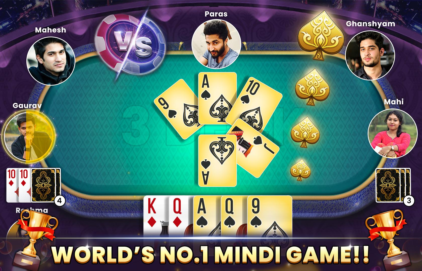 Der erste Live -Mindi -Mindi -Multiplayer der Welt. Mendi oder Mindi Cote ist Mendikot Dehla Pakad Beady Cotes Multiplayer Set Multiplayer Card -Spiel. Sie können täglich Freechips gewinnen.