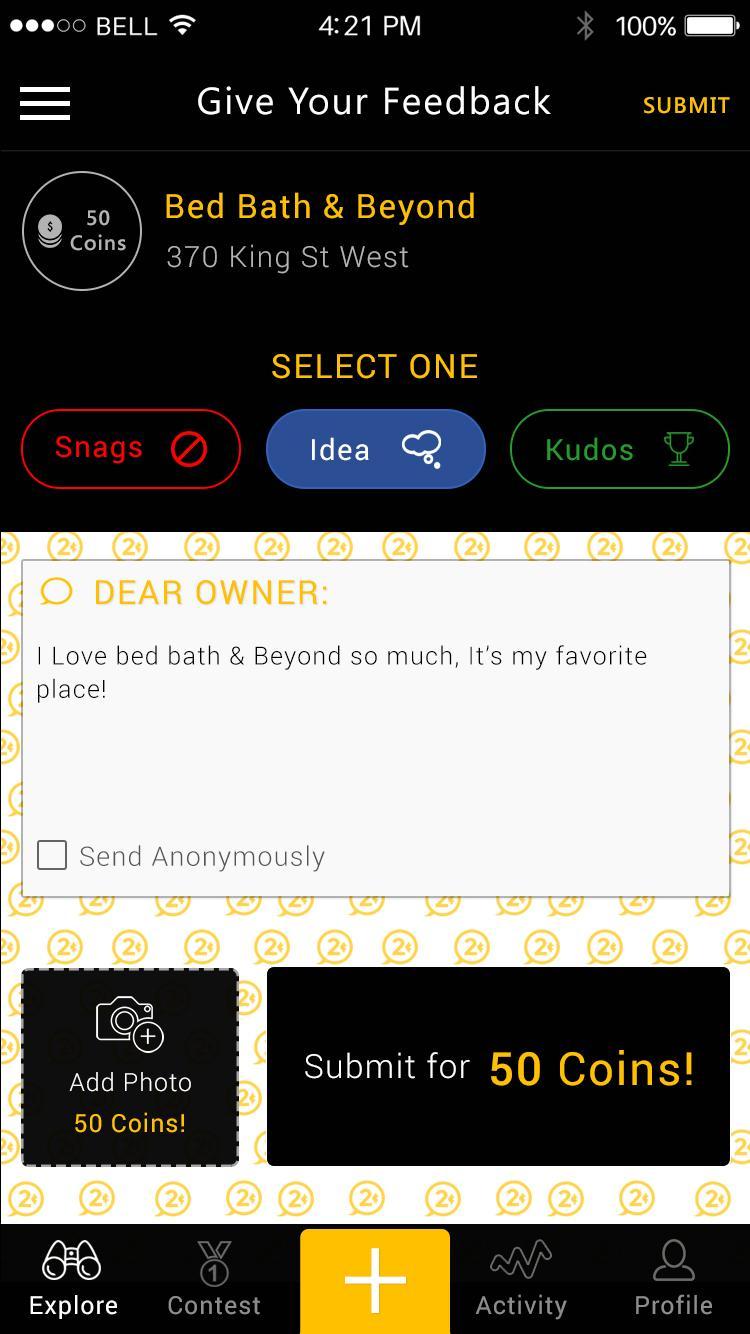 Die erste App, die Unternehmen die Wahrheit sagt. Eine ortsbasierte mobile anonyme Messaging -Anwendung, die Ihren 2Cents direkt an jedes nahe gelegene Unternehmen mit Haken, Ideen und Lobs sowie Gesamtbewertungen und Bildern bietet.