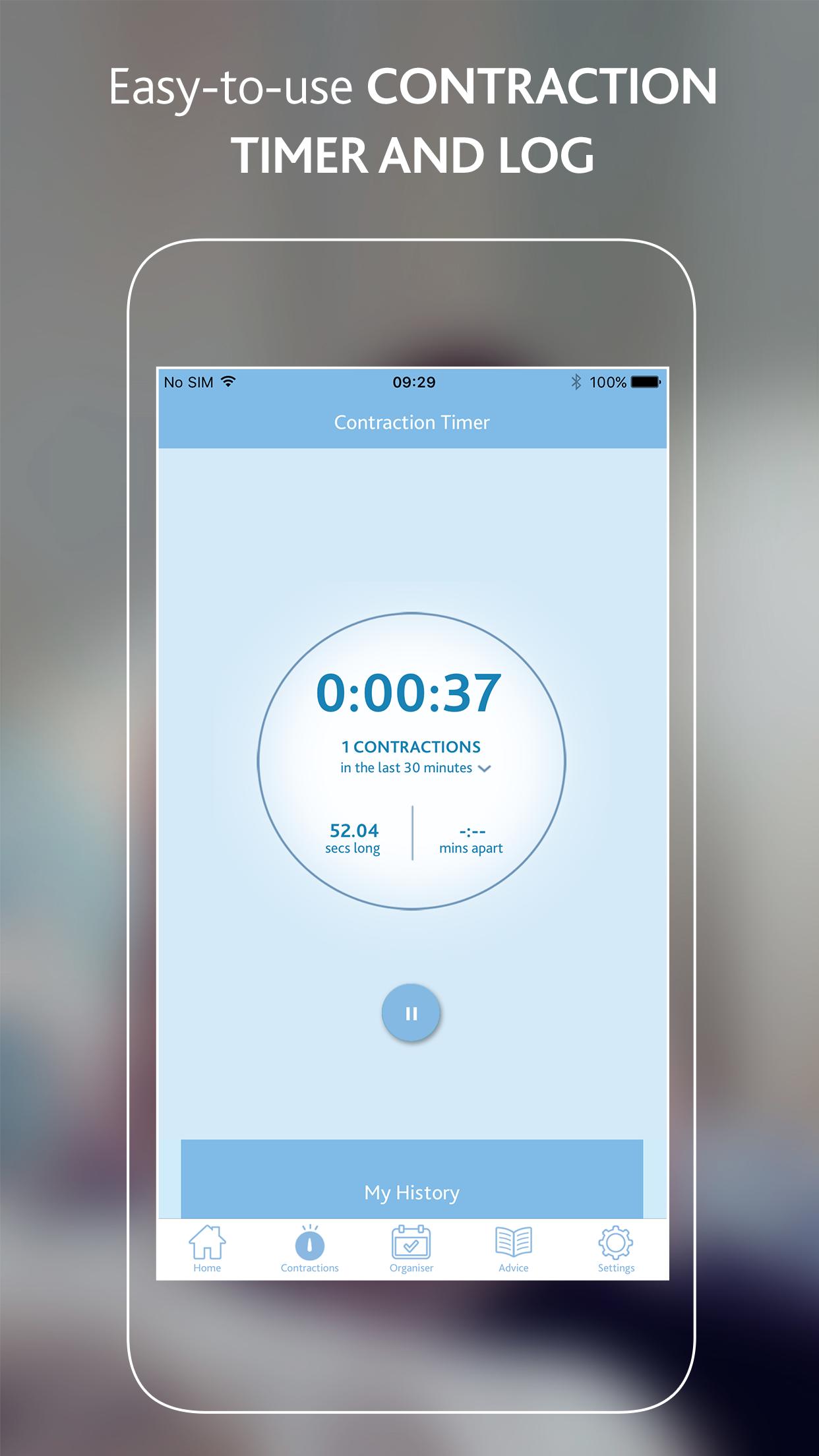 • Ein benutzerfreundlicher Timer, der sowohl die Dauer Ihrer Kontraktionen als auch die Zeit zwischen ihnen aufzeichnet, damit Sie ein detailliertes Protokoll haben, um Ihrer Hebamme zu geben