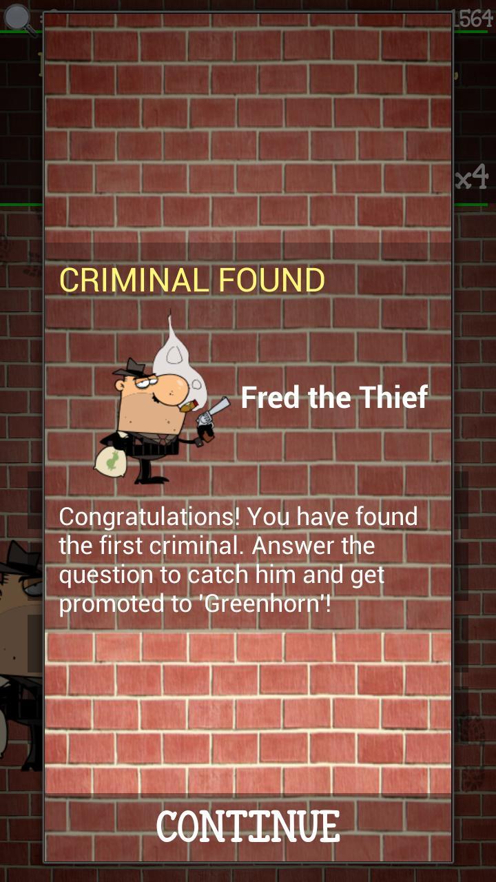 Ich bin froh, dass Sie es zum Briefing schaffen könnten. Einige Kriminelle wurden in der Stadt gesehen und wir brauchen Ihre Hilfe, um sie zu fangen. Beantworten Sie die Frage so schnell wie möglich, um Punkte und Combos zu erhalten. Dies wird Sie zu ihrem Versteck führen. Sammeln Sie eine Vergrößerungsbrille auf dem Weg, um nützliche Joker zu kaufen. Sie werden Ihnen helfen, selbst den hinterhältigsten Verbrecher einzusperren. Eine letzte Sache: Behalten Sie die Zeitleiste immer im Auge. Wenn es Null erreicht, geht die Spur zu ihrem Versteck verloren und Sie müssen erneut anfangen. Wir zählen auf Sie. Viel Glück!