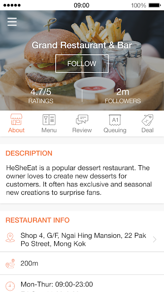 - Queuing: Advance queuing. Get your Queue Ticket in advance, view the restaurant menu and add your selections to your cart while you wait, then get notified when the table is almost ready.