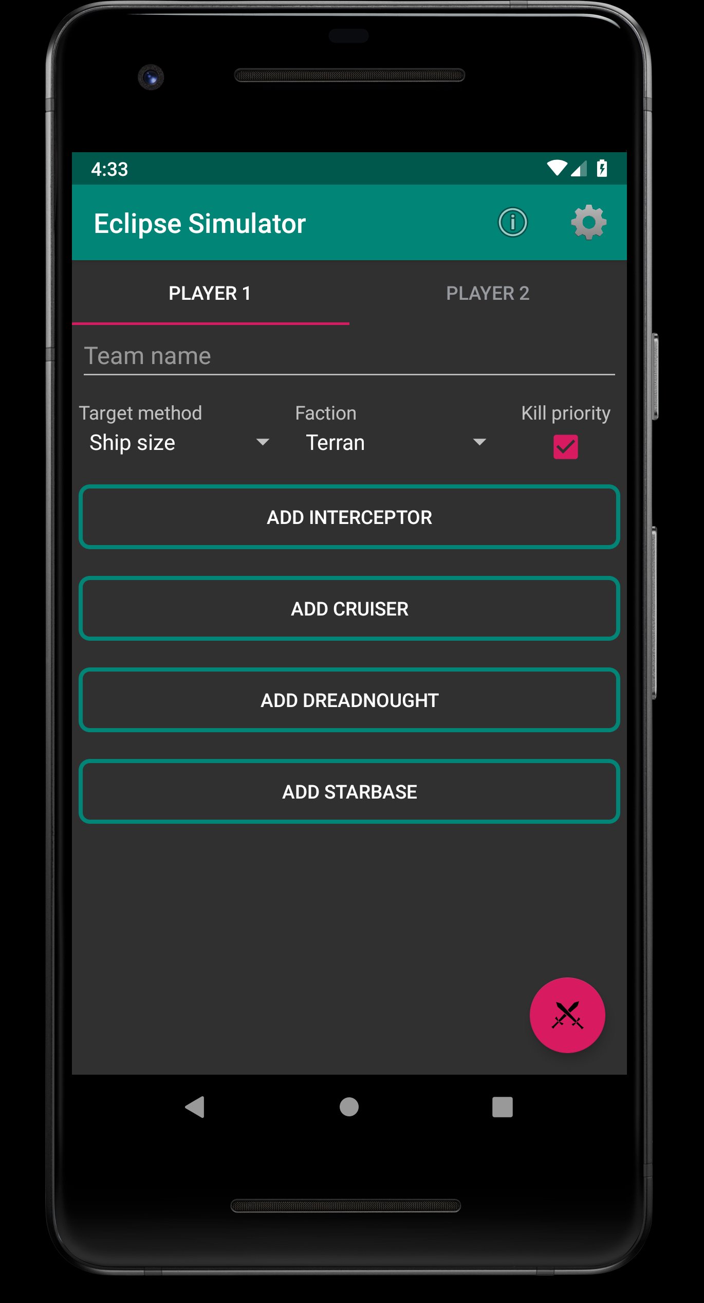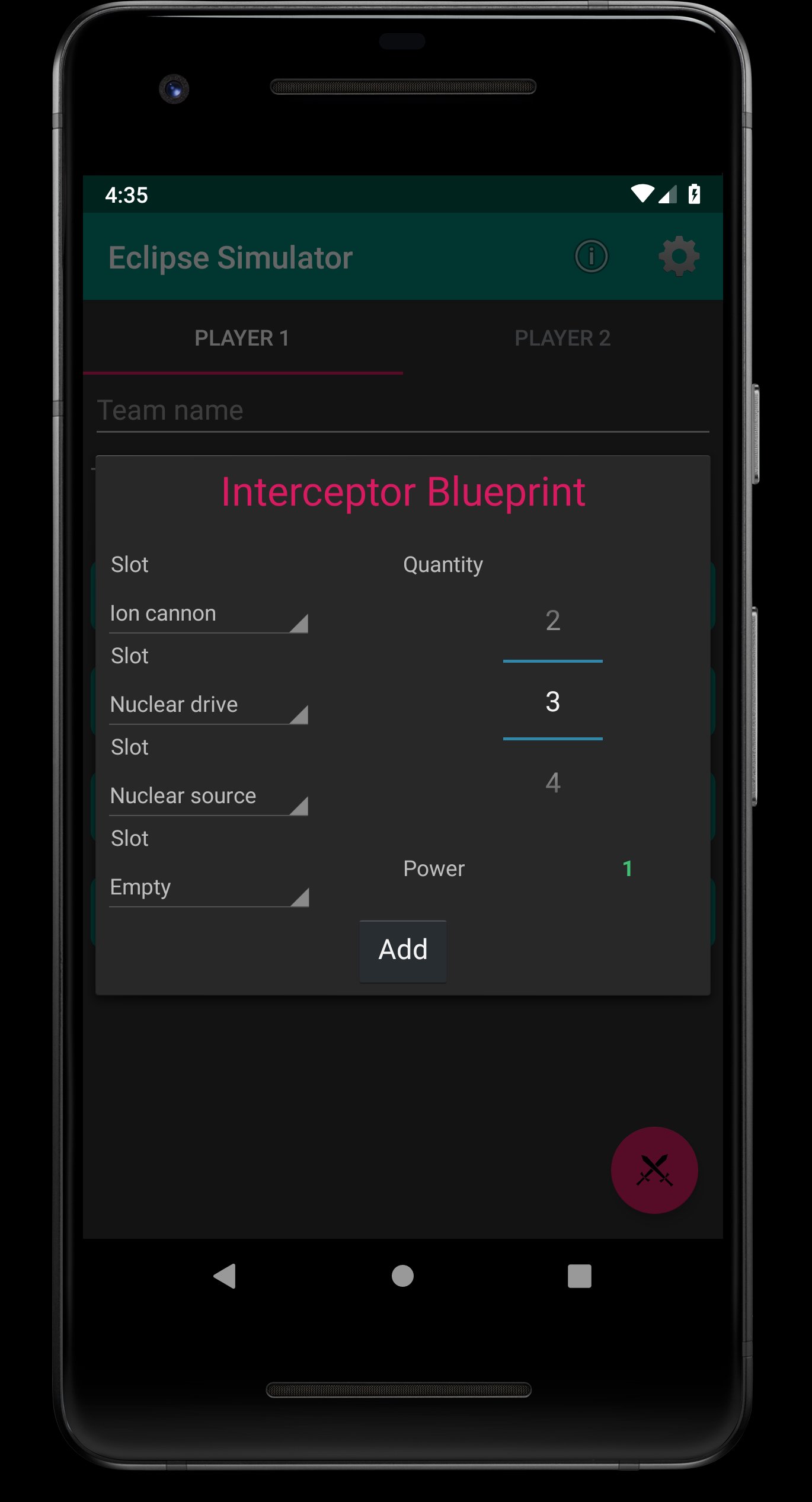 Simulates battles from the popular board game Eclipse: New Dawn for the Galaxy. The app will run simulations and display metrics based on the given ship designs, factions, and target methods chosen. Players can design the perfect fleet for any situation and enhance their board game experience. This app has no affiliation to the designers of Eclipse.