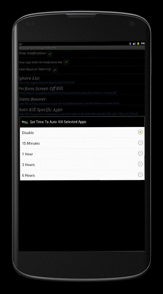 Auto Kill: en algún momento en que cierras algunas aplicaciones, siguen ejecutando en segundo plano. Seleccione las aplicaciones de uso frecuente y el administrador de tareas avanzados las matarán automáticamente después de un tiempo específico seleccionado por usted.