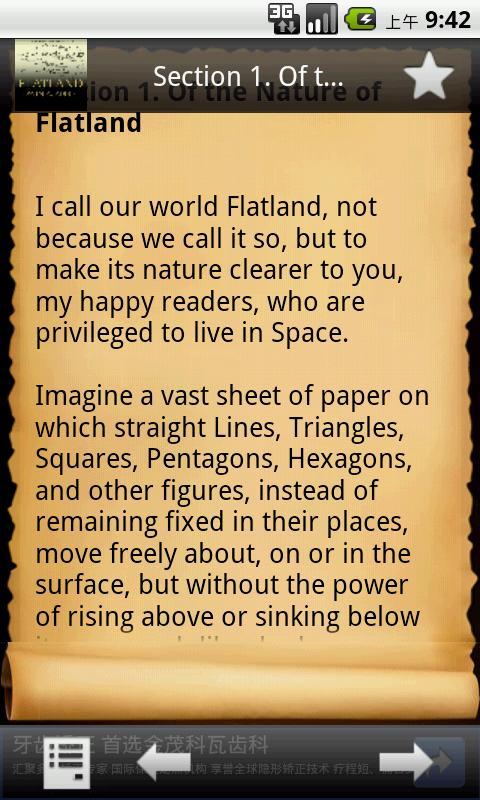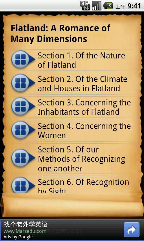 "Flatland: un romance de muchas dimensiones" es una aplicación de libros de Android basada en la plantilla de libros de Jiuboo. Jiuboo es una plataforma de publicación de aplicaciones de libros de Android desarrollada y mantenida por Ming Shen. Las aplicaciones de libros publicadas por Jiuboo pueden ser escritas por el editor o pueden ser los libros de dominio público. Los editores de aplicaciones no necesitan publicar libros a través de compañías editoriales, Jiuboo permite que cualquier libro y contenido se publique en dispositivos móviles y multimillones de usuarios de teléfonos inteligentes que pueden leer los contenidos de forma gratuita. Los editores obtienen ingresos de los clics en el banner de anuncios directamente.