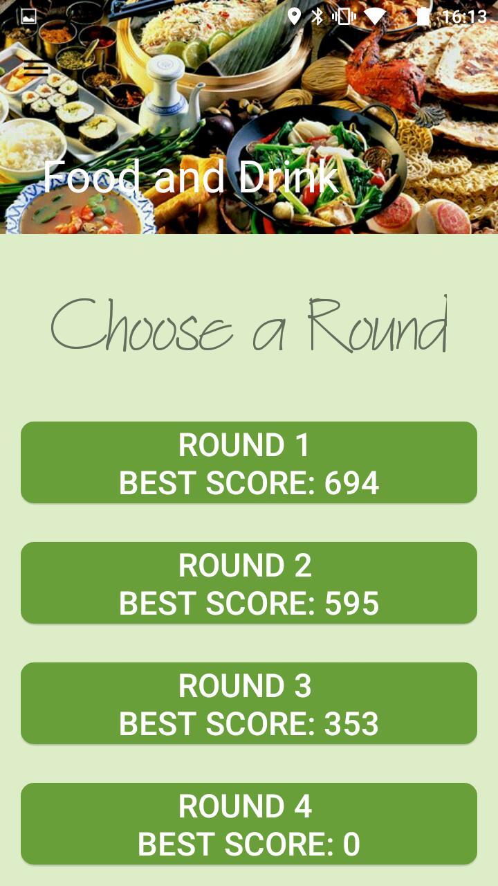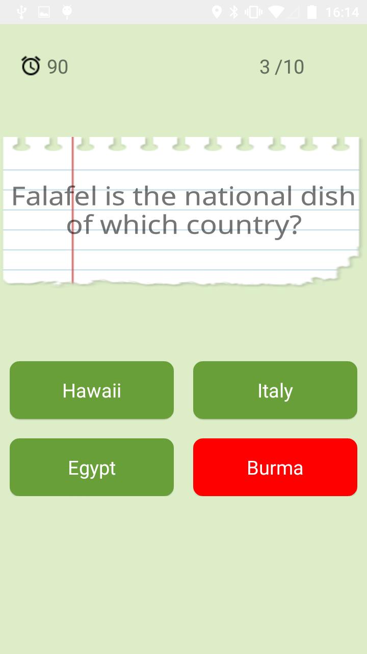 Prueba de trivia para un jugador donde responde preguntas sobre Food and Drink