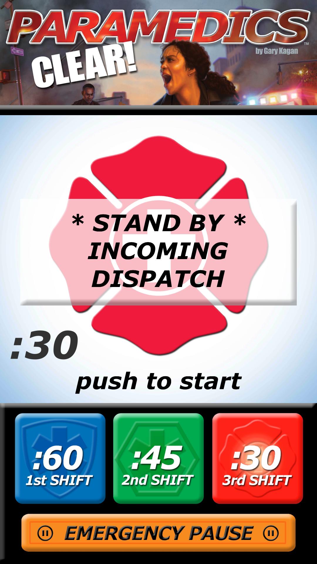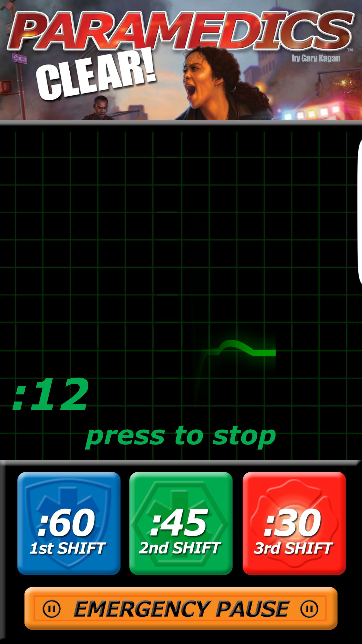 Esta aplicación complementaria para el juego de mesa de pulso, PARAMEDICS: CLEAR! Por los juegos Smirk & Dagger (requeridos para el juego), presenta tres temporizadores digitales para cambios cada vez más difíciles en los que está corriendo para salvar tantas vidas como pueda. Un monitor de corazón lo insta a que se apresure, con el reloj de 60, 45 o 30 segundos contando hasta una emergencia cardíaca, o si no es lo suficientemente rápido, ¡el tono plano de un DOA cada segundo cuenta!
