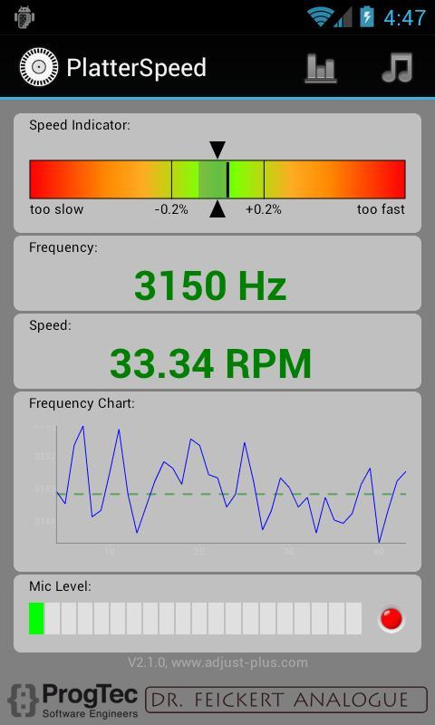 PlatterSpeed es una manera fácil de calibrar la velocidad de la plataforma giratoria a 33 1/3 o 45 rpm adecuados usando un tono de prueba de 3150 Hz.