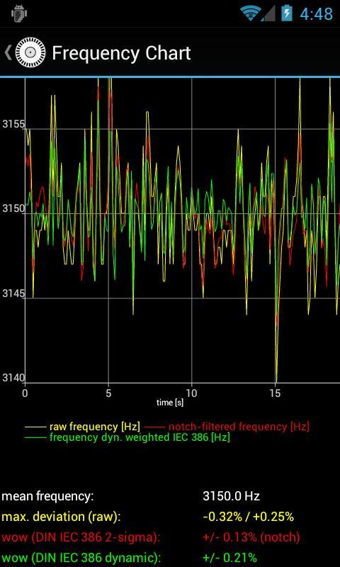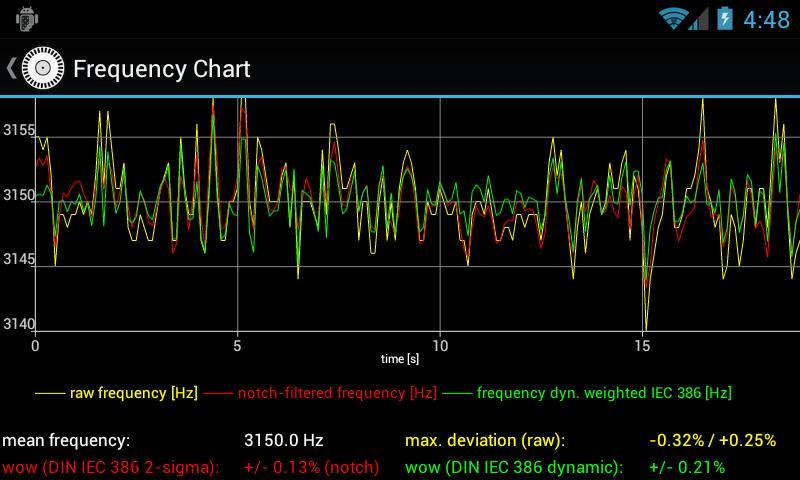 Medir la velocidad de esta manera es absolutamente exacto en contraste con el uso de un disco estroboscópico tradicional. La señal se puede registrar y luego se muestra en una vista gráfica del gráfico (frecuencia versus tiempo). Los datos se pueden administrar en archivos en el almacenamiento. Los datos de frecuencia también se pueden evaluar numéricamente.