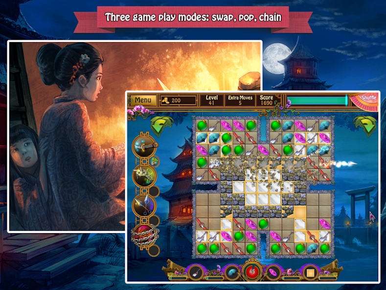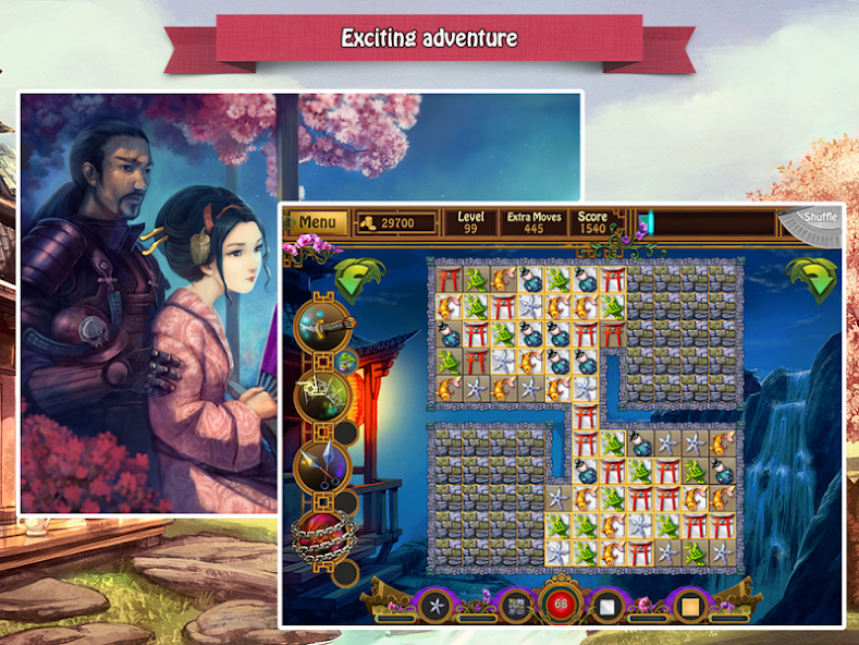 Viaje al período Edo en Japón y ayude a Satsu y Miyamoto en una aventura épica para preservar el antiguo Japón. Demuestre sus habilidades en modo de desafío con movimientos limitados. Experimente la emoción de construir una antigua aldea japonesa en este atractivo juego de Match 3. Vea el hermoso paisaje mientras escucha música relajante inspirada en este período en la historia japonesa. Sumérgete en una historia épica de honor y coraje y ayuda a una geisha y un samurai salve el día en Tales of the Orient: ¡el sol creciente!