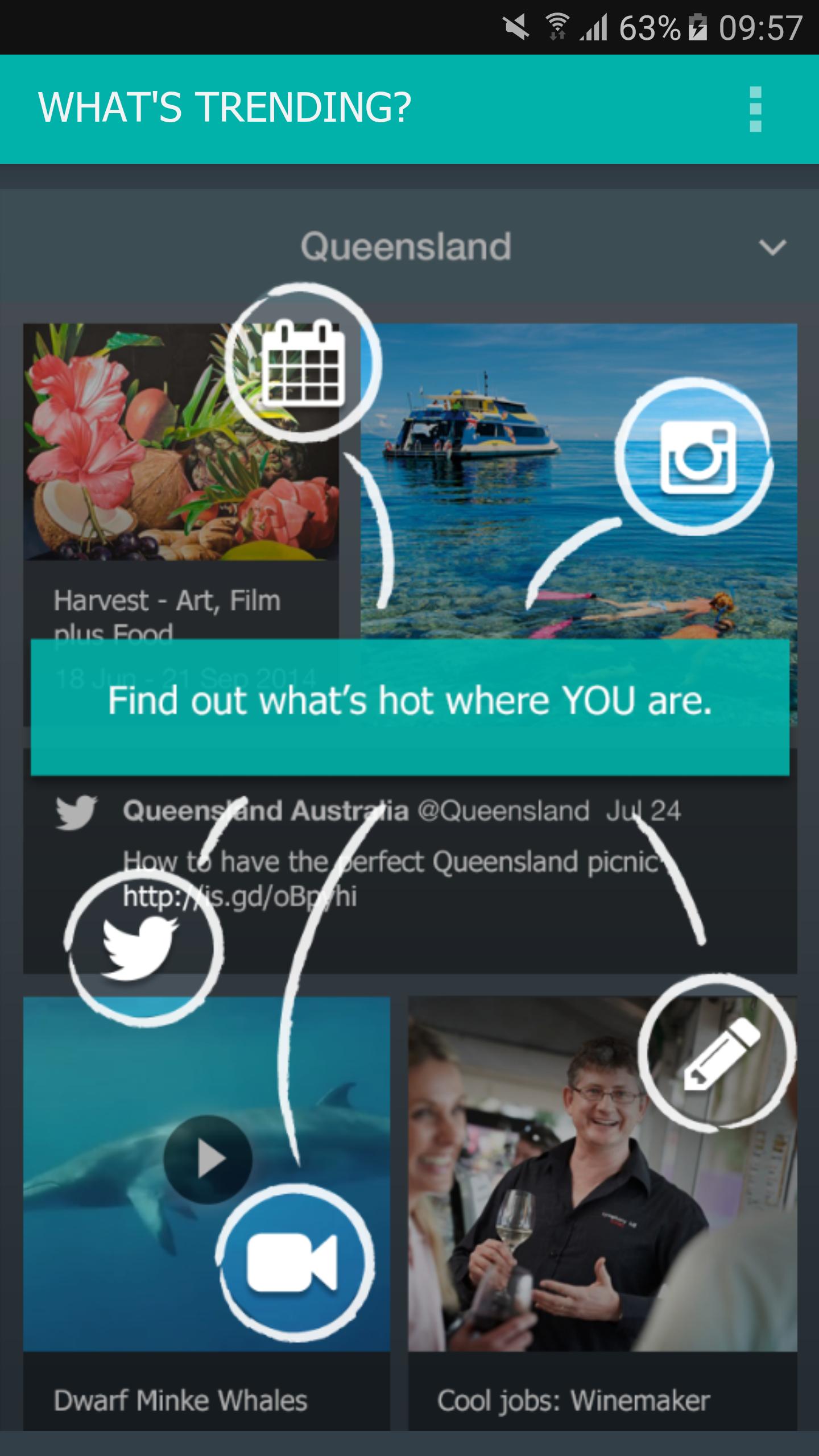 • Inspírate en lo que hay de moda y de tendencia en Queensland, con el bajo en los próximos eventos, contenido en vivo de las redes sociales (Instagram y Twitter), videos de YouTube y artículos del blog de Queensland.