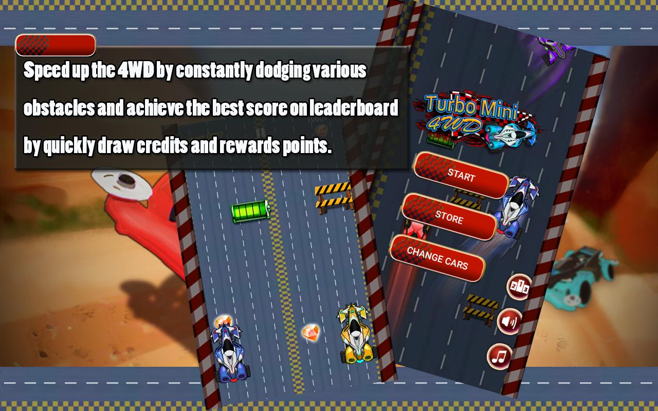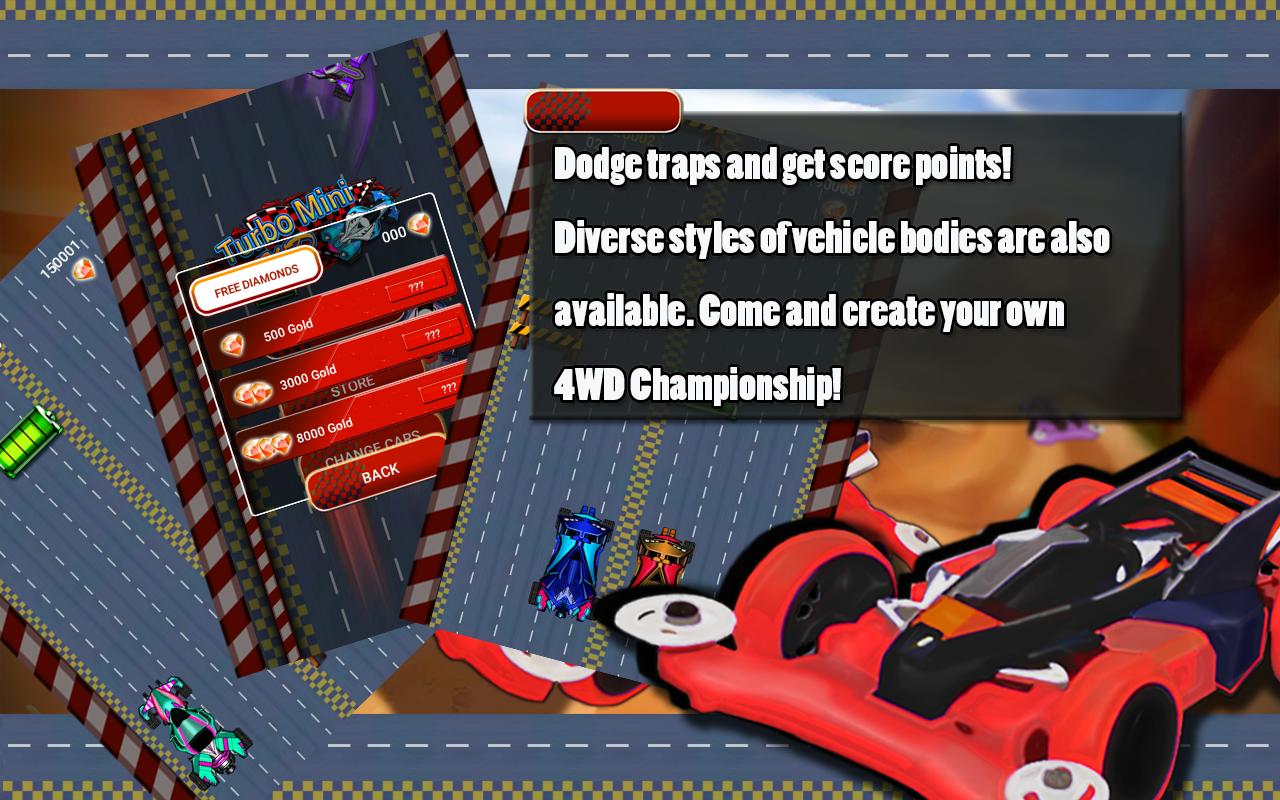 Acelere el 4WD esquivando constantemente varios obstáculos y alcance el mejor puntaje en la tabla de clasificación dibujando rápidamente créditos y puntos de recompensa. También están disponibles diversos estilos de cuerpos de vehículos. ¡Ven y crea tu propio campeonato 4WD!