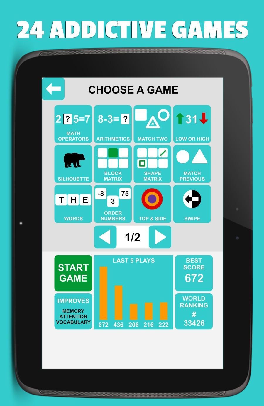 Avec 24 mini-jeux amusants, simples mais addictifs, vous pouvez désormais former vos compétences de mémoire visuelle, de concentration, d'attention ou d'observation sur votre téléphone mobile ou votre tablette.