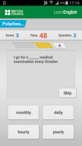 Votre vie privée est très importante pour nous. Nous suivons la façon dont l'application est utilisée, comme les jeux joués, mais nous utilisons uniquement ces informations pour améliorer l'application. Nous pouvons parfois vous envoyer un message sur les services de votre centre de conseil britannique local. Nous détectons votre emplacement en fonction de votre position GPS. L'utilisation continue de GPS fonctionnant en arrière-plan peut réduire la durée de vie de la batterie. En savoir plus sur la politique de confidentialité du Conseil britannique ici: https://www.britishcouncil.org/organisation/transparency/policies/information-security-privacy