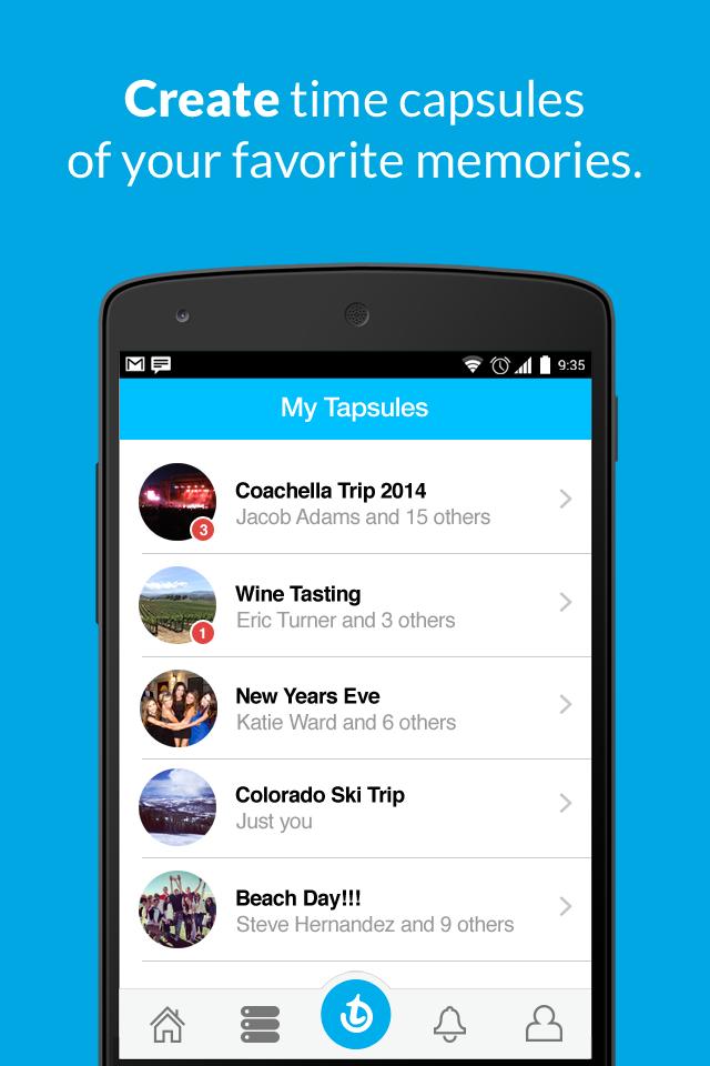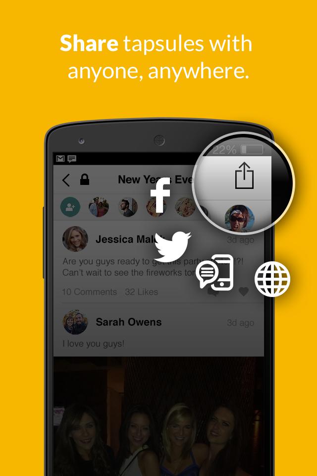 Publiez plus qu'une seule photo, partagez une histoire incroyable avec Tapsule . Tapsule vous permet de capturer collectivement des photos, des vidéos et des SMS par vous-même ou parallèlement à des amis et les publier sur vos réseaux sociaux, ou les partager par e-mail et SMS. Découvrez et suivez d'autres membres inspirants pour voir ce qu'ils contribuent et plongez dans leur Tapsule S pour obtenir l'histoire complète.
