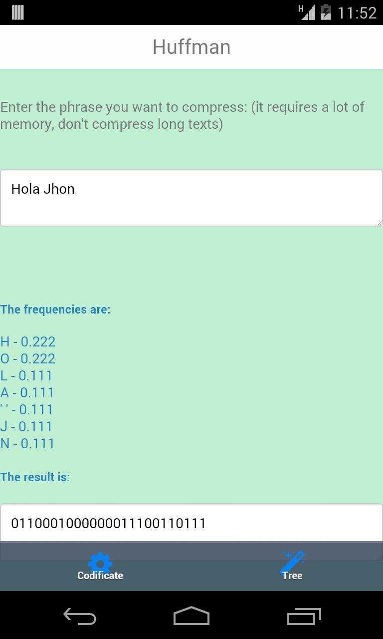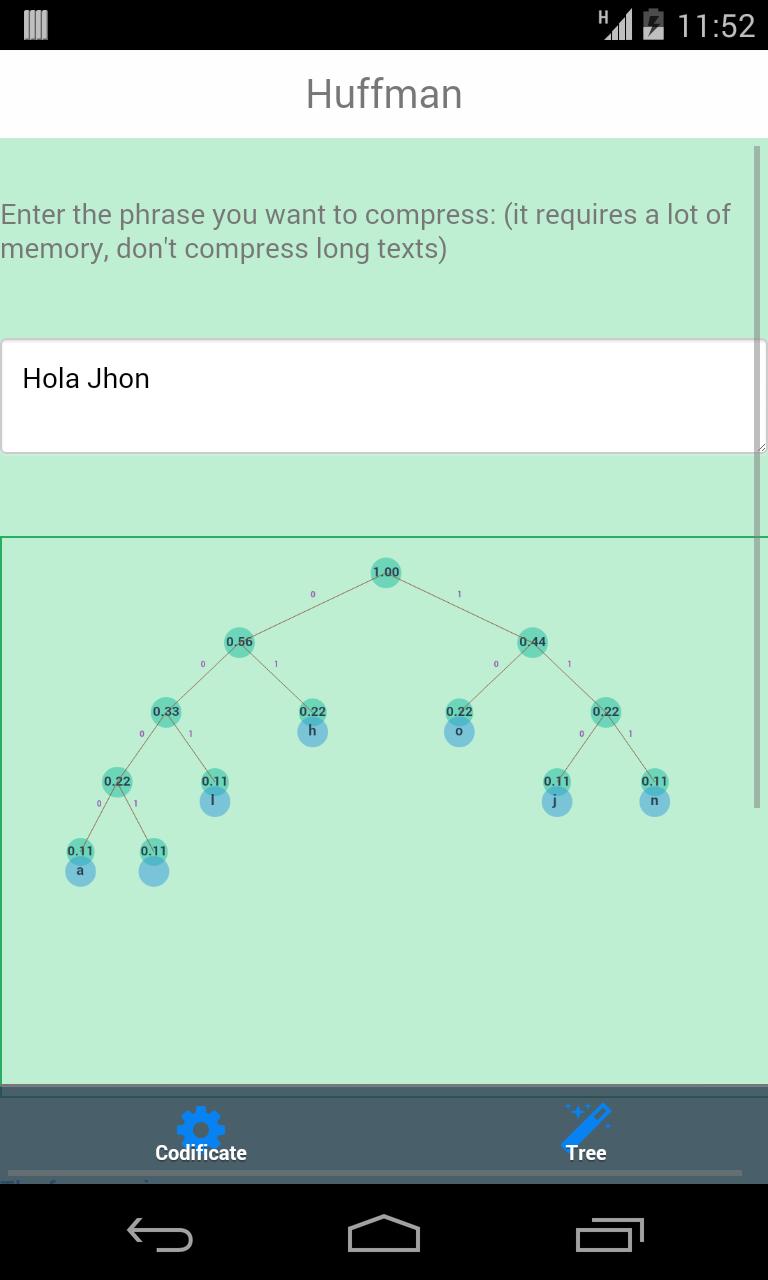 With this app, you can compress all texts you want. It's really fast and easy, just put your text and click a button. Also, the app do the huffman tree for you, it's pretty cool and easy.