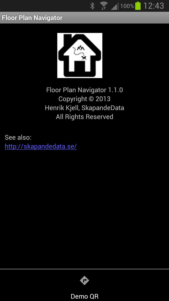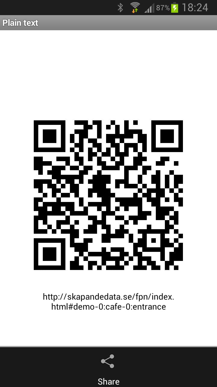 Untuk mendapatkan item menu baru "Hasilkan QR" (v1.1.0) agar berfungsi dengan baik, muat ulang denah lantai demo dari skapandedata.se, kode QR dihasilkan menggunakan tujuan dan lokasi saat ini.