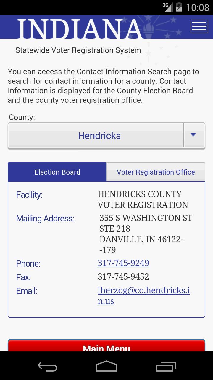 Selain itu, aplikasi seluler pendaftaran pemilih di seluruh negara bagian Indiana memungkinkan Anda untuk mencari informasi pendaftaran pemilih, seperti mengkonfirmasi pendaftaran pemilih Anda, menemukan lokasi pemungutan suara terdekat dengan arahan mengemudi, melihat kandidat dan pertanyaan mana yang akan muncul pada pemungutan suara Anda, dan memeriksa status surat suara sementara atau yang tidak hadir.