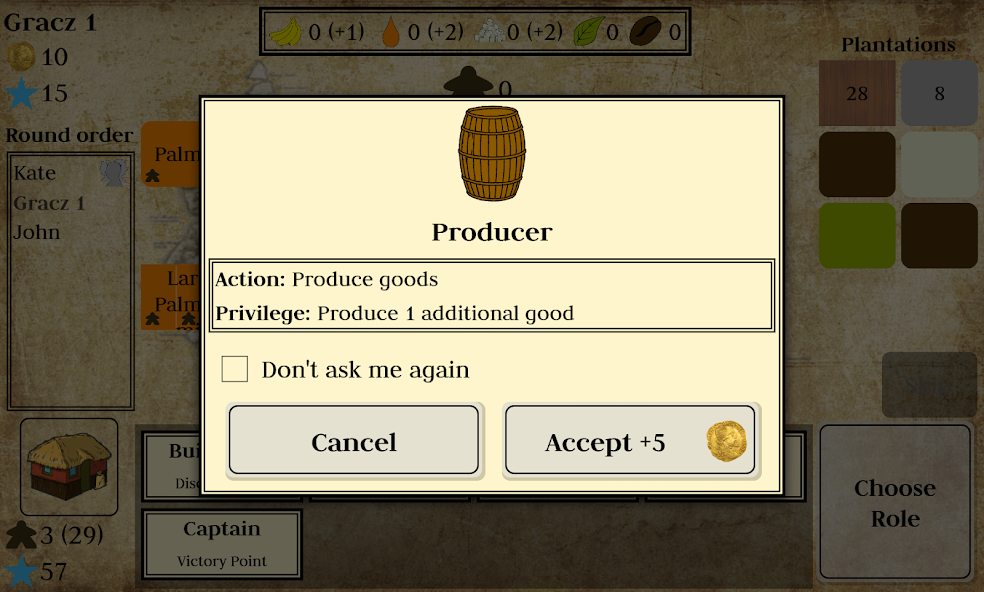 Selamat datang di pulau yang indah ini. Saat ini kosong tetapi dengan Anda yang bertanggung jawab, itu akan menjadi kota makmur terbaik di kepulauan. Menjadi Gubernur, tempatkan perkebunan, membangun bangunan, dan kumpulkan sumber daya Anda. Pilih tindakan Anda dan dapatkan poin kemenangan. Yang mengumpulkan paling banyak akan menang.