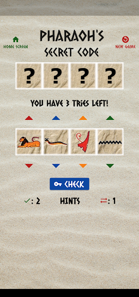 Kode rahasia Firaun adalah 4 blok. Kode akan disembunyikan sampai Anda memecahkan kode. Anda memiliki 10 percobaan untuk menyelesaikannya.