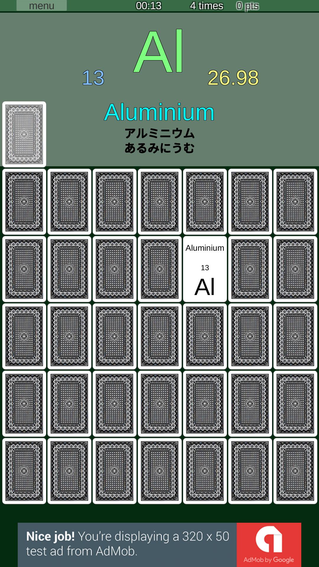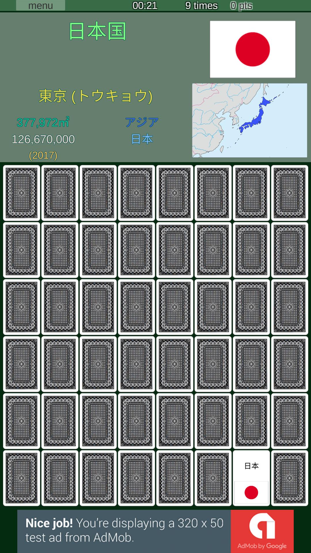 Ini adalah game pertarungan (memori atau konsentrasi). Ada set "kartu", "bendera nasional", "Kana Jepang", "alfabet Inggris", "simbol atom" dan "kanji Jepang" (semua kanji diajarkan di sekolah dasar). Secara berurutan, saya berencana untuk menambahkan set kartu baru. Saya berencana untuk meningkatkan konten terutama bagi mereka yang ingin belajar tentang bahasa Jepang dan Jepang. (Untuk saat ini, hanya "Kana Jepang", "Kanji Jepang" dan "Peta Jepang" yang tersedia.)