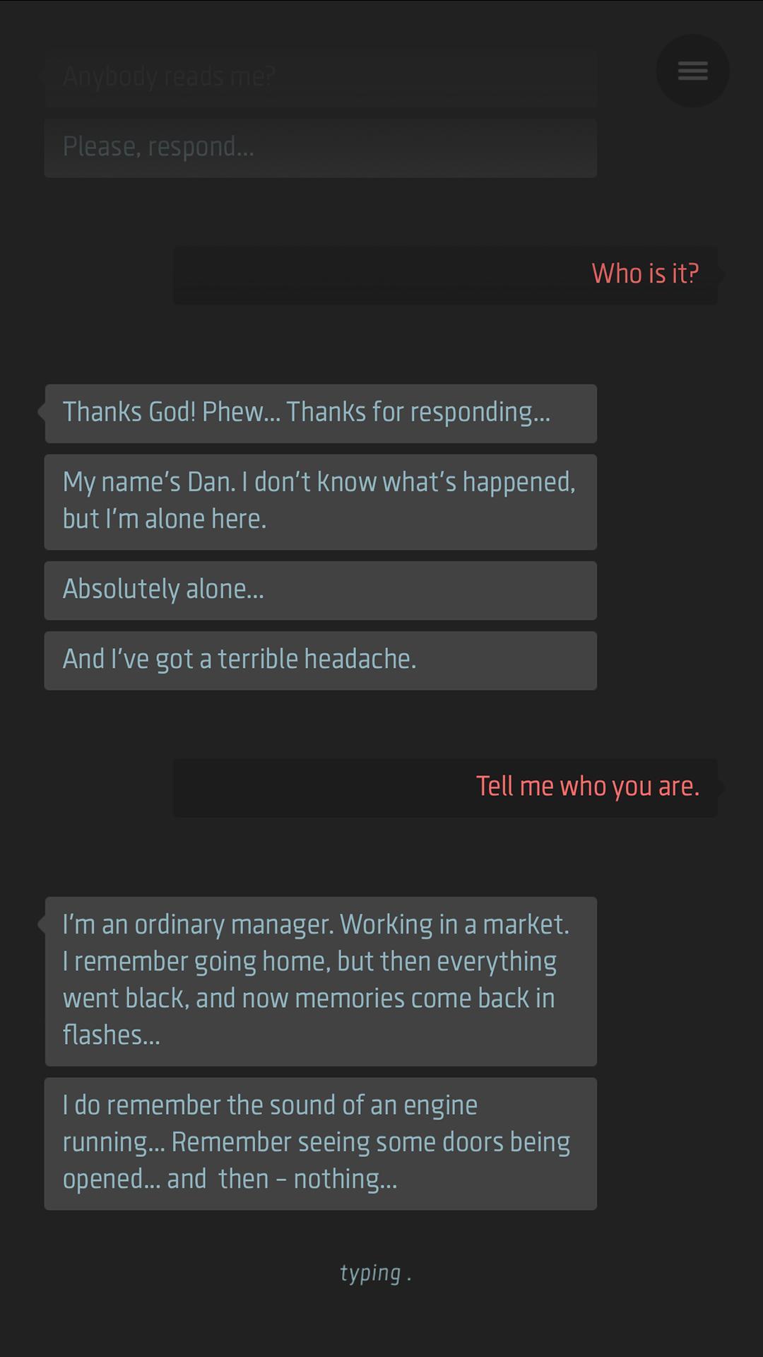 Bahaya yang mematikan dan misteri yang mengejutkan dapat dilihat bukan hanya di film ... bantu Dan untuk keluar dari perangkap - hidupnya sekarang ada di tangan Anda. Tunggu pesannya muncul di ponsel cerdas atau tablet Anda, dan pikirkan dengan cermat sebelum Anda memberikan saran, karena setiap langkah bisa menjadi yang terakhir!