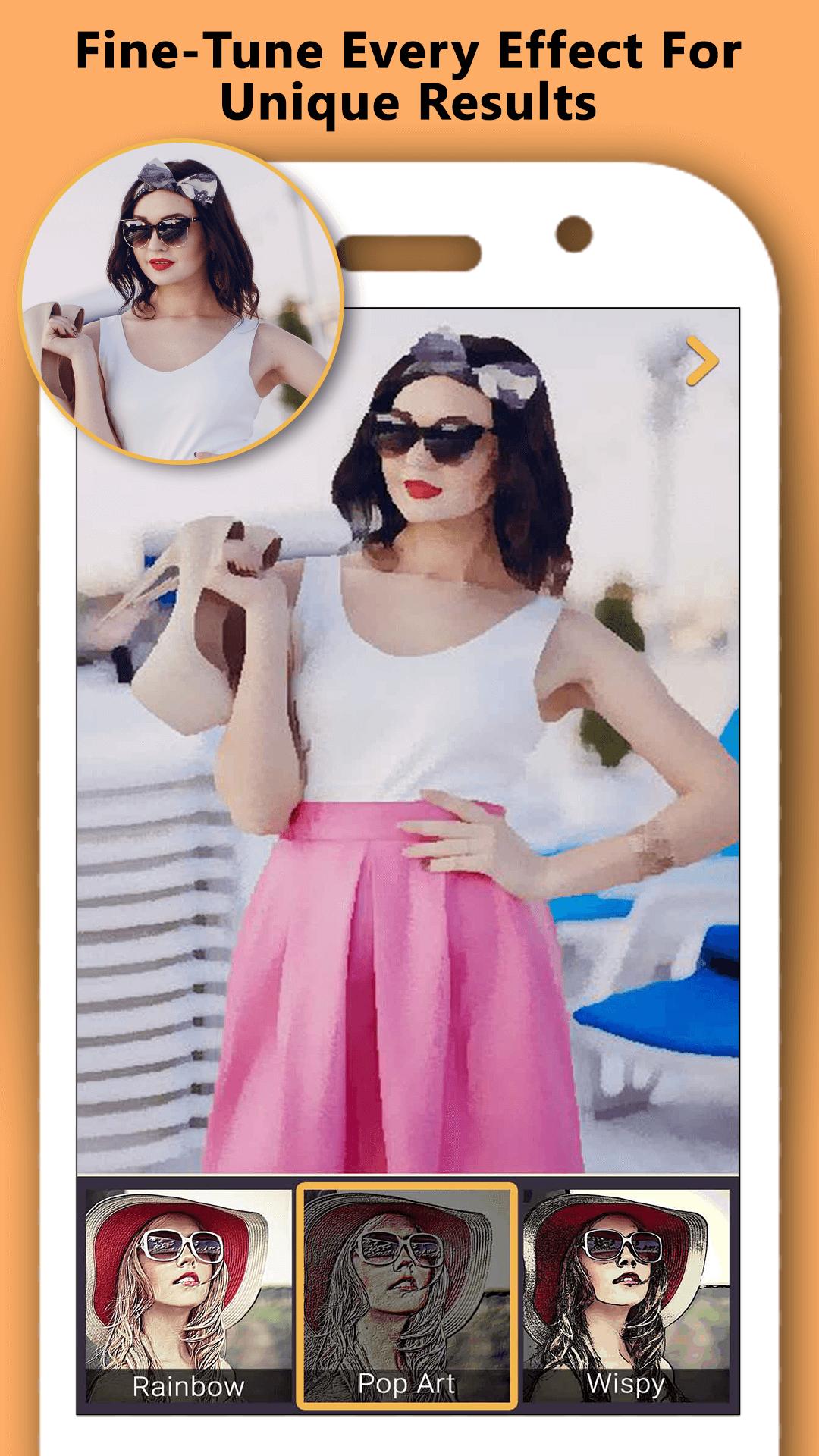 3. Lebih dari 20 efek: Efek kartun, emboss, jazzy, poster, toon halus, tatapan, pixilation, swirl dan banyak lagi.