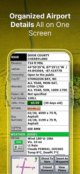 公共空港と民間の空港情報の両方に公式データベースを使用する公共 /民間空港。データベースは、FAAデータサイクルから直接更新されます。チャートやマップ上にない場所の独自のカスタムウェイポイントを作成します。