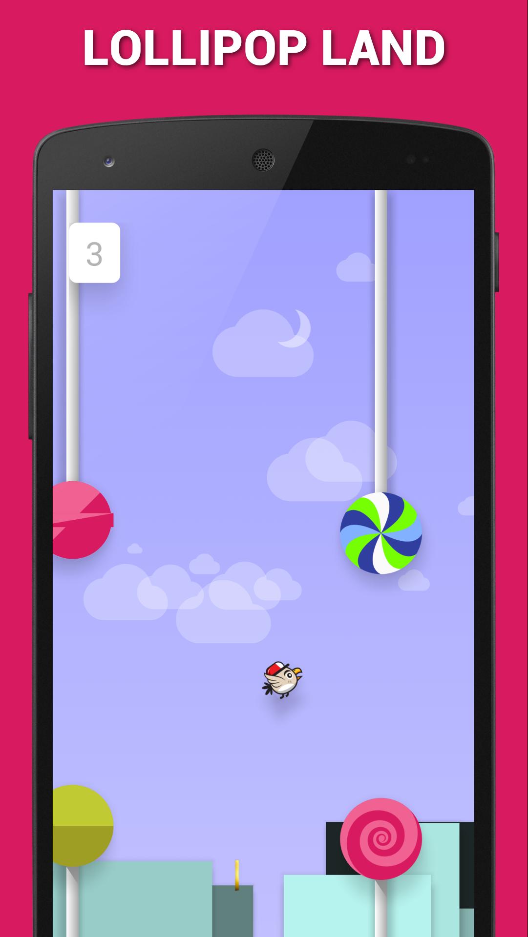 ?鳥の代わりに、プレイヤーはAndroidマスコット(bugdroid)です。レトロをテーマにしたパイプの代わりに、障壁はロリポップです。画面をクリックすると、自動的にゲームプレイに入ります。ゲームのオブジェクトは、バグドロイドが地面にぶつからないように画面をタップすることにより、各ロリポップバリアを通過することです。