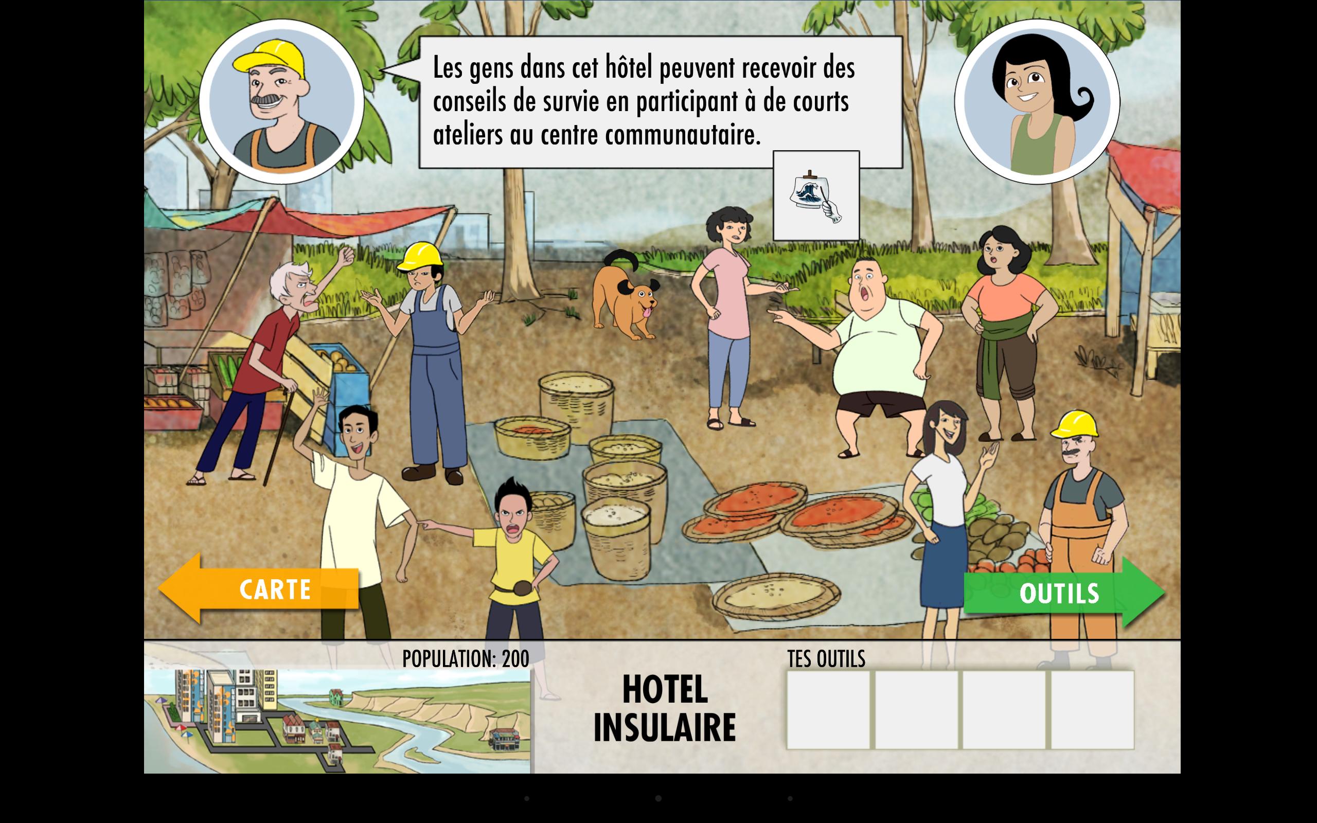 'Earth Girl 2 : 쓰나미 준비'는 지진이 발생했을 때 해안 지역 사회에서 생존 가능성을 높이고 쓰나미가 뒤 따르는 전략을 수립하는 데 구성된 대화식 재미 게임입니다. 이 작업은 시장, 카드, 도구 상자 및 대피 시나리오를 제공하는 약 20 레벨의 놀이의 네 가지 영역에서 이루어집니다. 이 게임의 유산은 사전 예방 적 탐험을 장려하는 반면, Earth Girl과 마을 사람들은 게임 전반에 걸쳐 지식, 조언 및 의견을 제공합니다. 시장 사람들과 대화하여 쓰나미의 위험에 대한 지식을 동화시키고, 주어진 예산에 따라 도구를 선택하고 사이트가 이루어지는 사이트를 탐색합니다. 관찰에 따라 전략적이며 시뮬레이션을 살펴보면 수업을 배우기 위해. 이 게임에서 플레이어의 성공 수준은 가상 커뮤니티와의 상호 작용 수준에 달려 있습니다.