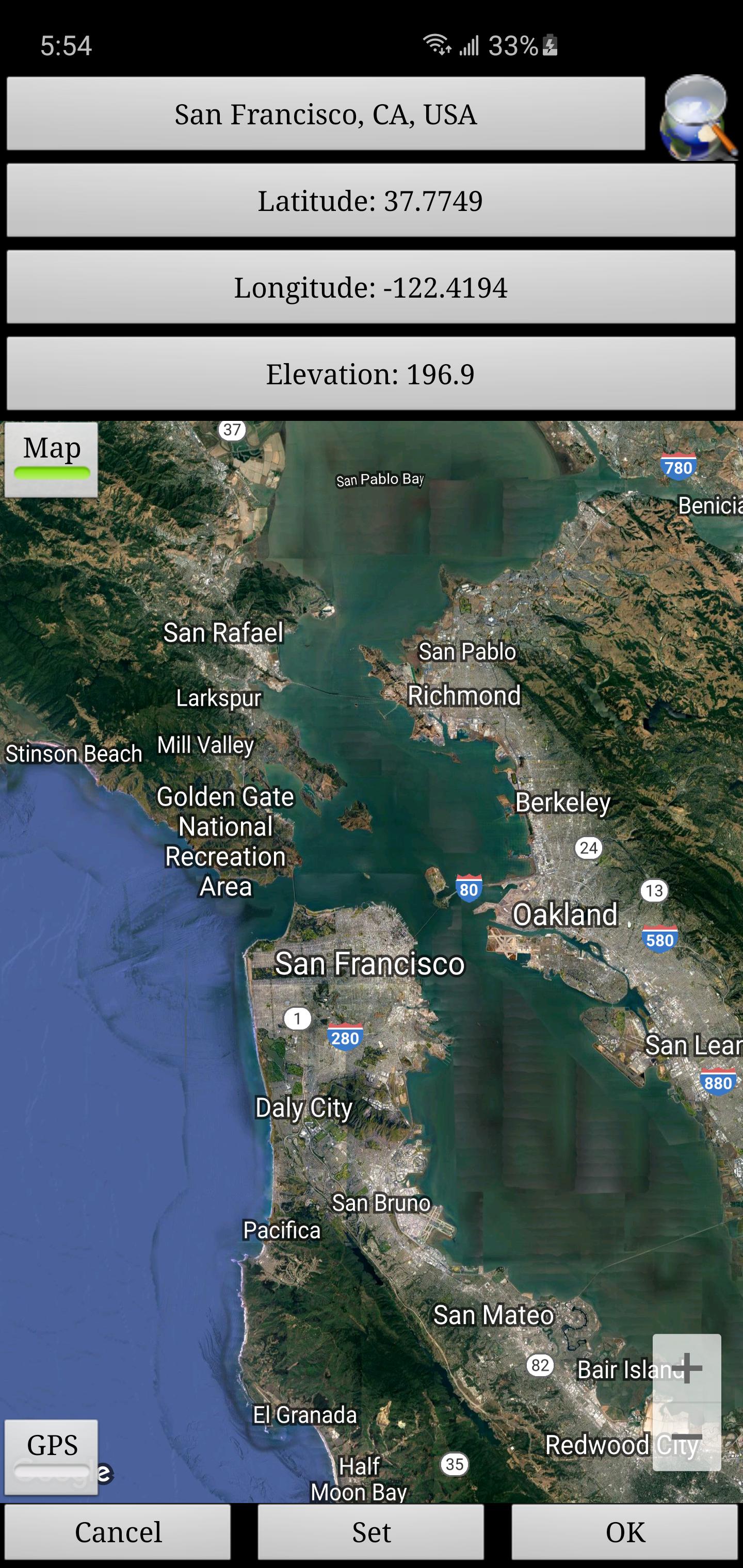 • 맵 입력 - 맵을 사용하여 확대 / 축소 및 팬을 위치로 팬. 설정 버튼을 누르면 텍스트 상자의 위치 이름, 좌표 및 고도가 설정됩니다. 현재 좌표의 고도는 지정된 고도 데이터 소스 설정을 사용하여 검색됩니다. 지도/SAT 버튼을 토글하여지도와 위성 모드 사이를 전환하십시오.