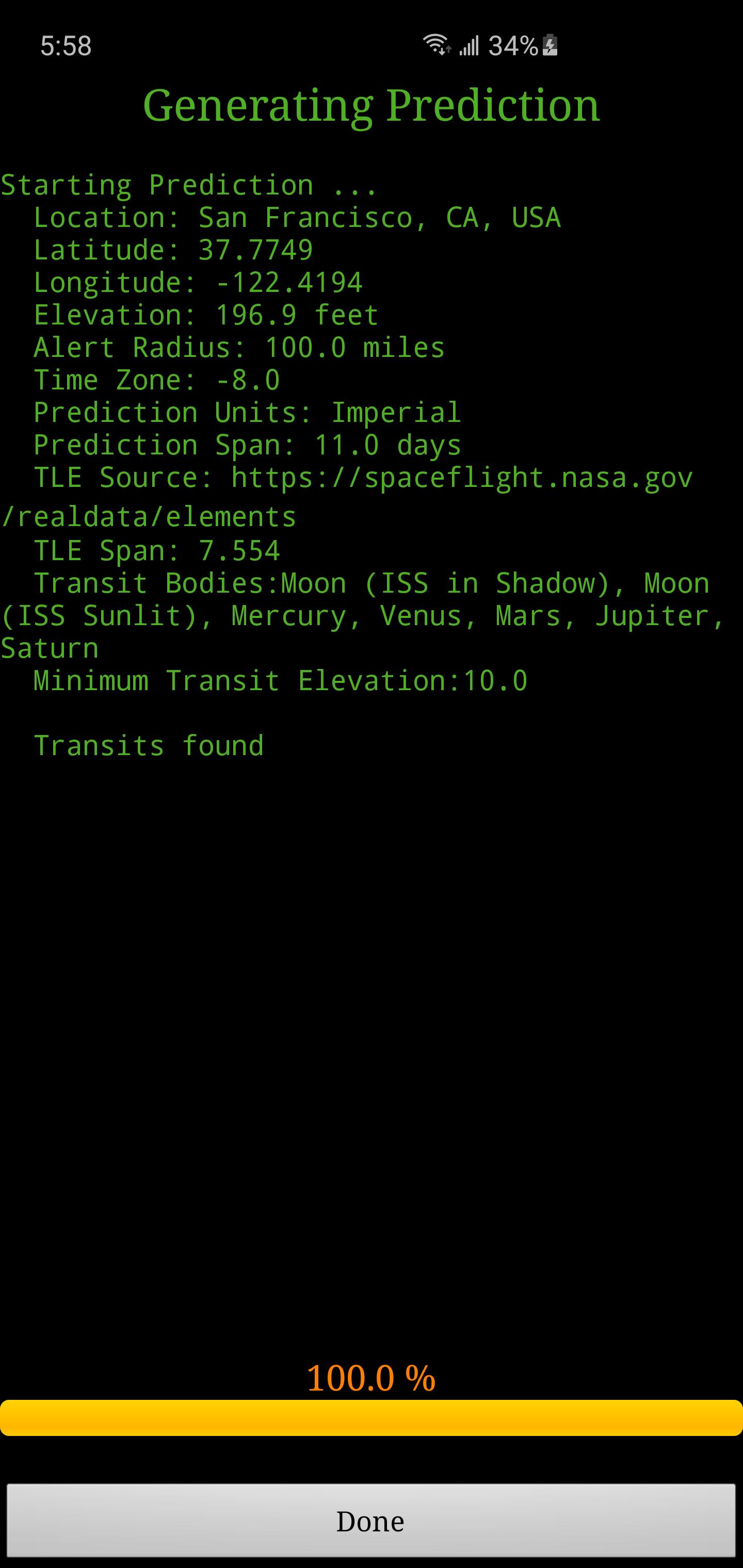 위치가 입력되고 TLE가 다운로드되면 "예측 생성"버튼을 눌러 예측 생성을 시작하십시오. 진행률 바는 프로세스를 완료하는 데 걸리는 시간을 표시합니다. 프로세서 속도에 따라 예측을 생성하는 데 몇 분이 걸릴 수 있습니다. 취소 버튼을 누르면 예측이 취소됩니다.