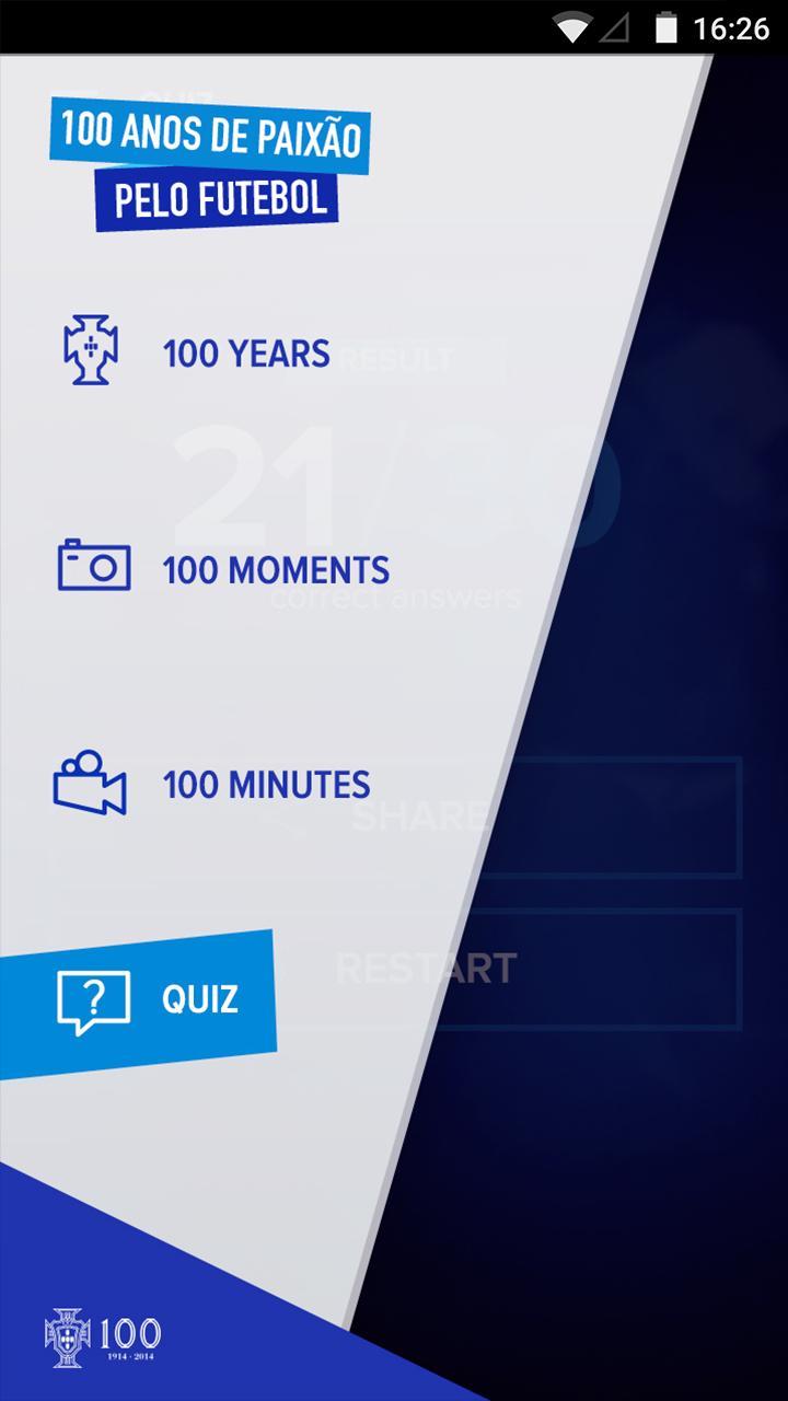 Desde 31 de março de 1914, o futebol em Portugal tem sido uma identidade nacional. No centenário da Federação Portuguesa de Futebol, em parceria com a RTP e com o apoio tecnológico da Samsung, compartilhamos essa paixão e, por meio desse aplicativo, honramos os heróis, lendas e momentos nos últimos 100 anos fizeram da história do futebol português