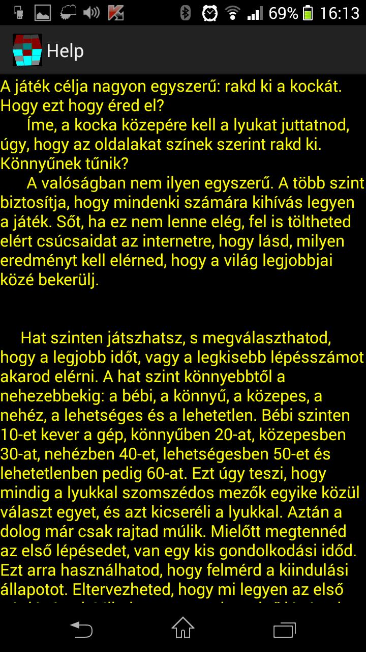 O objetivo do jogo é muito simples: resolva o cubo. Como você pode fazer isso? Você precisa levar o "buraco" (parte ausente) no meio do cubo enquanto completa as faces do cubo de acordo com as cores. Parece simples, não é? Bem, na verdade, não é tão simples. Existem vários níveis (do nível "bebê" ao "insolúvel") para garantir que o jogo apresente um desafio a todos os seus jogadores. Você pode compartilhar sua pontuação alta na Internet e ver como você combina com o melhor.