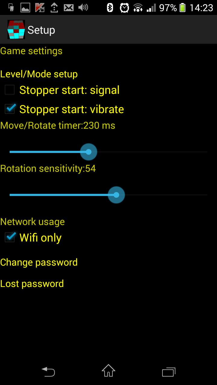 - Mover/girar o timer: você pode definir um horário (em milissegundos) para uma peça começar a se mover em direção ao buraco e um tempo após o qual um toque é considerado uma intenção de girar.