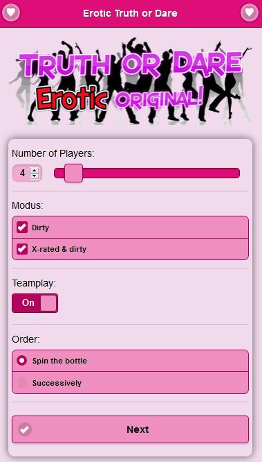 Este jogo é a versão oficial do jogo erótico e oferece recursos abrangentes, como girar a garrafa, jogar em equipes, pontuação dos jogadores, verdades ou desafios sujos e extra sujos (eróticos). Tudo pode ser selecionado individualmente!