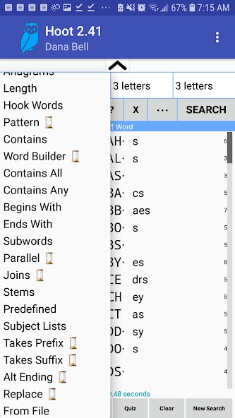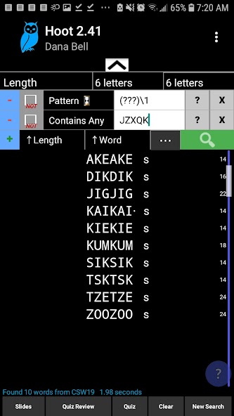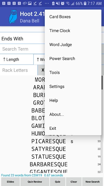 Hoot possui várias opções de pesquisa (veja abaixo), e a tela de entrada permite inserir vários parâmetros, incluindo o número de letras, começos e finais. Você pode especificar o pedido de classificação com duas especificações (classificar por, então por). Os resultados são exibidos em formato comum, mostrando ganchos e ganchos internos com pontuação na margem. Opcionalmente, você pode mostrar rankings de probabilidade e jogabilidade e número de anagramas.
