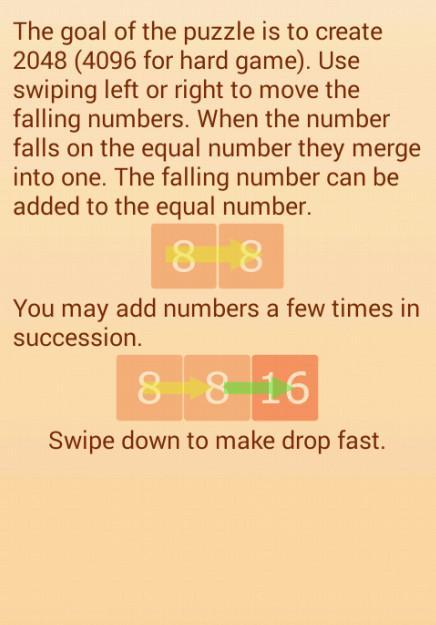 O objetivo do quebra -cabeça é criar 2048 (4096 para um jogo duro). Use deslizar para a esquerda ou direita para mover os números queda. Quando o número cai no número igual, eles se fundem em um. O número em queda pode ser adicionado ao número igual. Você pode adicionar números algumas vezes em sucessão. Desça para baixo para fazer uma queda rápida.