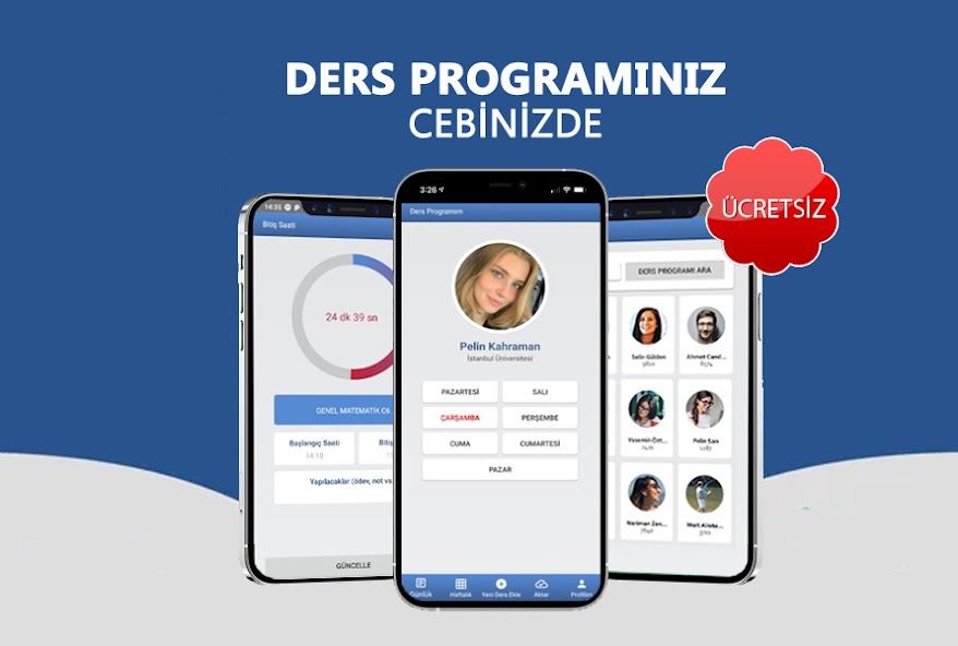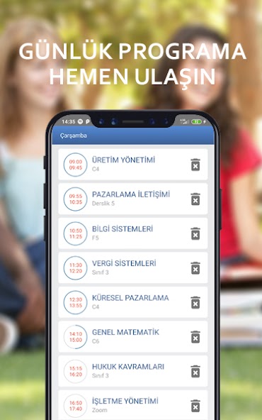 É uma aplicação rápida e prática que você pode adicionar seu cronograma e acesso ao curso a qualquer momento. Você pode ver quantos minutos restam até o final da lição, segundo a segundo. Você pode compartilhar seu plano de estudos com outros usuários e adicionar o plano de estudos compartilhado por outros usuários ao seu próprio aplicativo. Graças ao seu widget, seu horário de aula para esse dia está na tela.