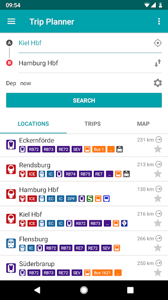 Um planejador de viagem individual para todos os trens e ônibus dentro de Schleswig-Holstein: você pode optar por pesquisar por seu local atual, um endereço específico ou o ônibus ou estação de trem mais próxima. Nosso planejador de jornada oferece as conexões mais rápidas, a distância exata necessária para percorrer, trilhas, número da plataforma e tempo de transferência.
