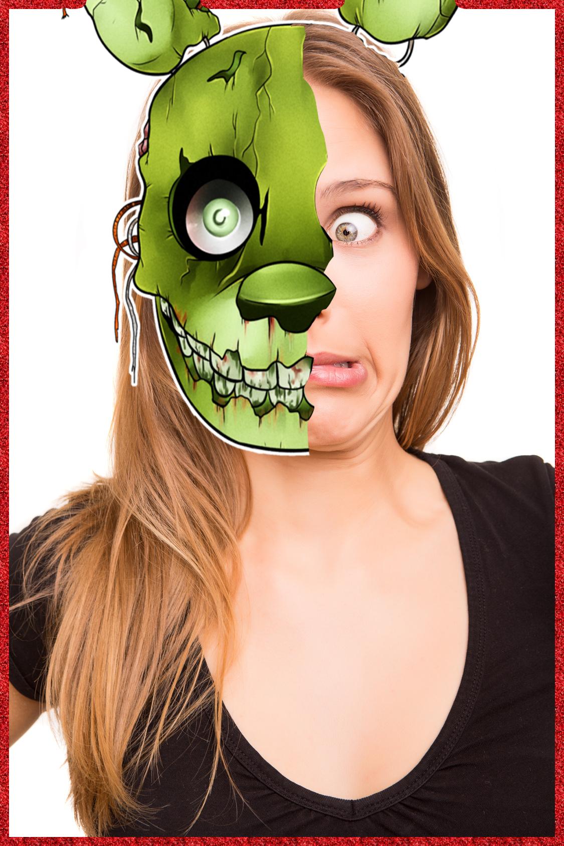 O adesivo de foto do FNAF permite fazer fotos com diferentes campos de ação e permite que você coloque a máscara de horror de sobrevivência do pesadelo na sua cabeça fora do " Photo Editor For FNAF World ".