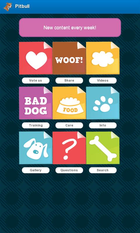 Pitbull Dogs , aplicativo para Android. Se você possui um pitbull ou planeja comprar um filhote em breve, este aplicativo de raças de cães é para você. Aproveite a beleza desta raça de cachorro do seu telefone celular ou tablet. Inclui dezenas de fotos de cães, fotos e papéis de parede, informações sobre seu cão, aulas de treinamento e muito mais. Conteúdo detalhado: