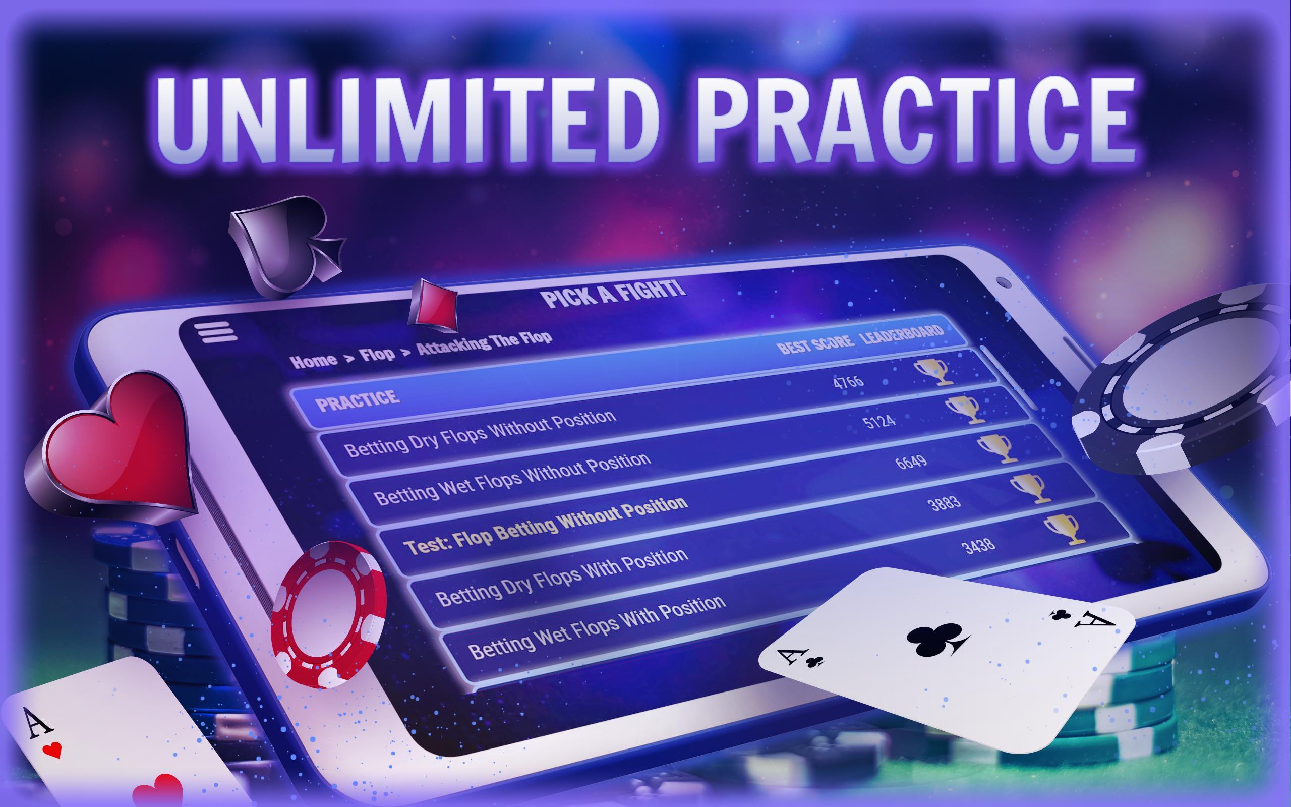 Você pode jogar, praticar e melhorar o uso deste treinador exclusivo que simula jogos e torneios reais do Texas Hold'em Cash.