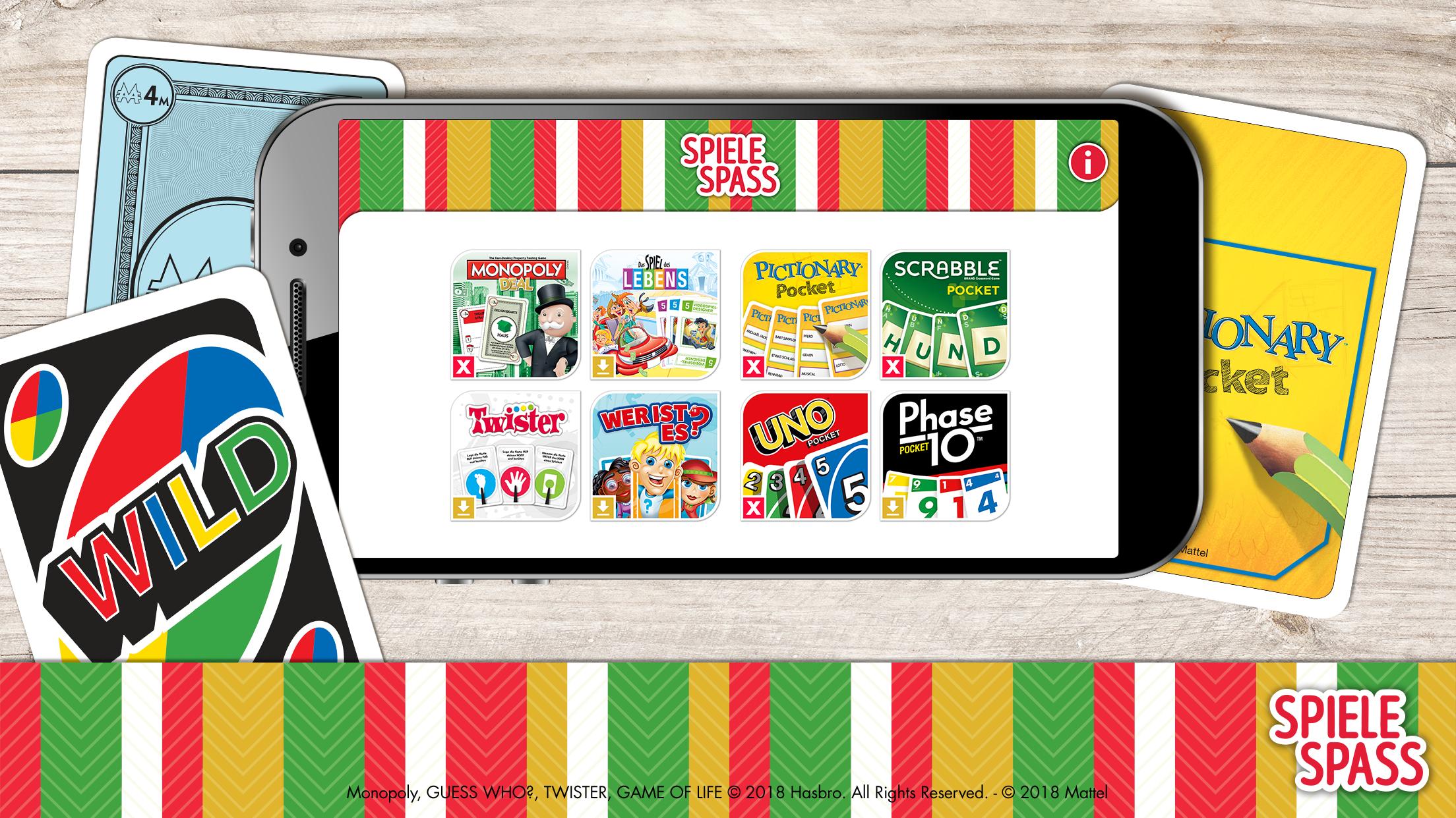 No aplicativo "GameSpass", você pode baixar 8 extensões de aplicativos para o acordo de monopólio de jogos de cartas, Twister, quem é isso?, Game of Life, Fase 10 Pocket, Uno Pocket, Pictionary Pocket, Scrabble Pocket. As extensões de aplicativos só são jogáveis juntamente com o jogo de cartas correspondente. Eles podem ser baixados individualmente.